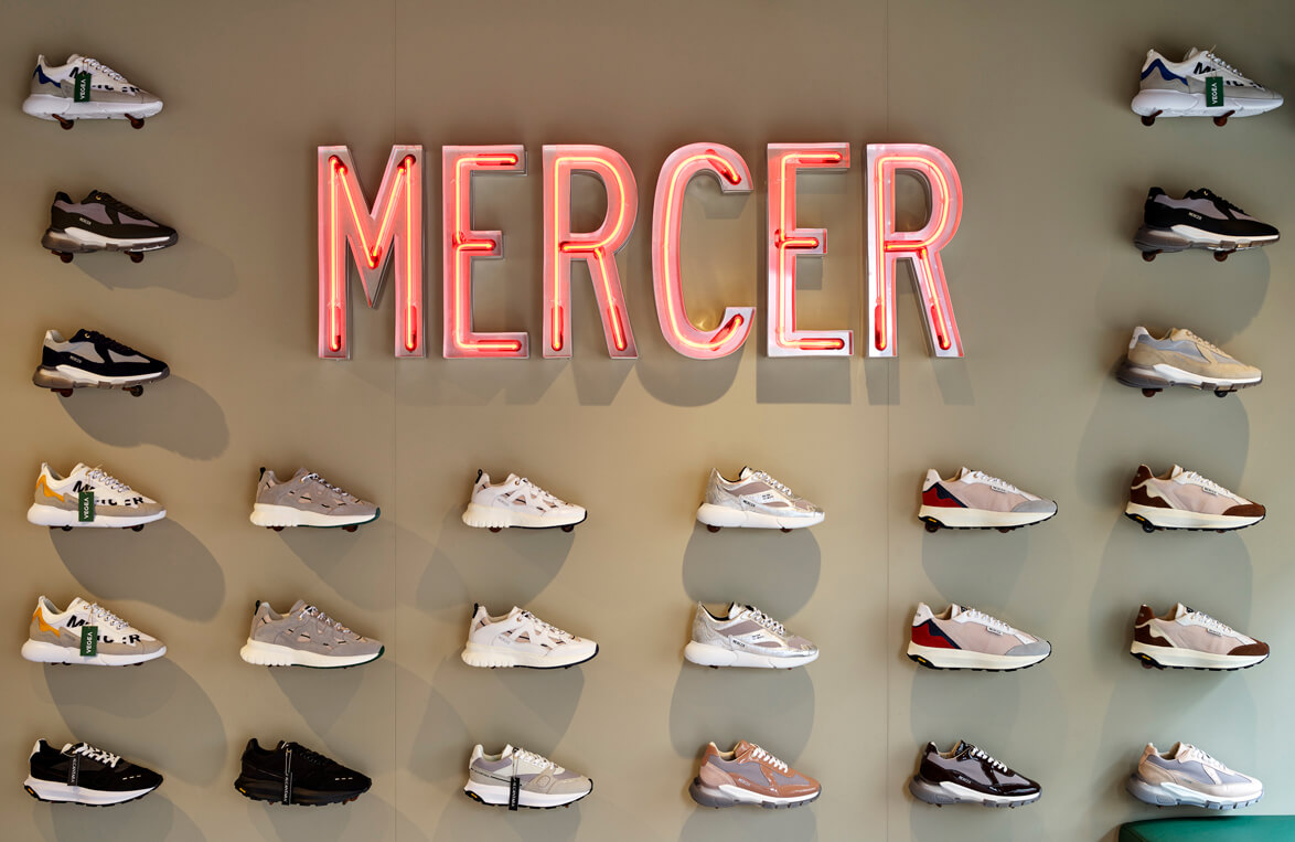 ‘De winkel is voor Mercer veel belangrijker gebleken dan we van tevoren konden inschatten,’ legt hij uit. ‘Ik heb in het coronajaar 2020 getekend voor dit pand. En ik dacht: we zien het wel, al verkoop ik één paar schoenen, ik heb ook een fijn kantoor hier. Ik dacht dat de retail dood was, maar het loopt als een dolle. Ik zit hier nu vijf maanden, en zie voor het eerst de doelgroep binnenkomen. Bovendien krijg je meer pers met een winkel, en meer passanten die je anders nooit hadden ontdekt. Naast Nederland zijn Engeland en Frankrijk belangrijke landen voor ons. En deze winkel is echt een eyeopener. Dus ik heb nu twee panden in Londen in optie, maar kan er vanwege de corona helaas nog niet kijken. Daarna volgt Parijs. De focus is nu gericht op de eigen kanalen: eigen winkels en eigen webshops. Je kan in je winkel veel meer je merkverhaal en beeld creëren. Dat is zo belangrijk. Bovendien vind ik niets leuker dan wanneer er bijvoorbeeld een jongen binnenkomt die gave sneakers koopt en dat je dan kan zeggen dat die sneaker is gemaakt van gerecyclede plastic flessen. Zo’n jongen vindt dat dan ineens heel vet. Terwijl hij daar helemaal niet mee bezig was. Hij wilde gewoon mooie sneakers. En zo probeer ik dan klant voor klant de wereld te verbeteren.’